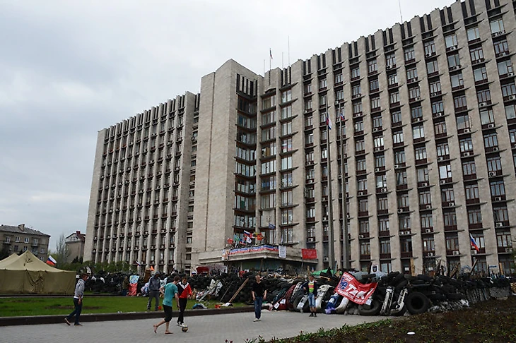 2014 год, Донецк. Футбол на фоне баррикад у здания областной администрации.