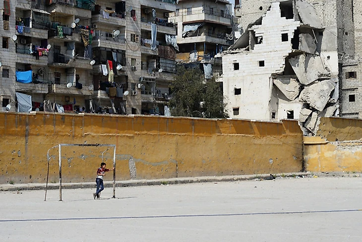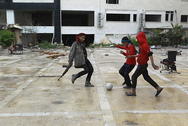 2014 год, недалеко от Алеппо, боец оппозиционной Свободной армии Сирии играет в футбол прямо с автоматом.