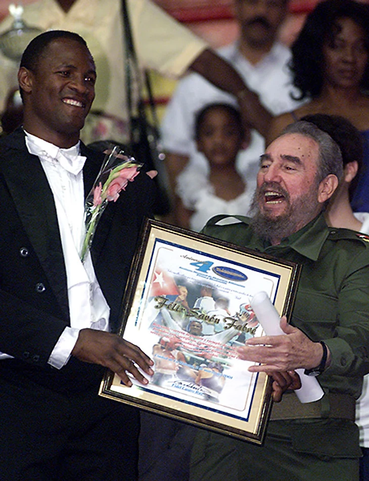 Кастро награждает трехкратного олимпийского чемпиона по боксу Феликса Савона (1992, 1996, 2000).