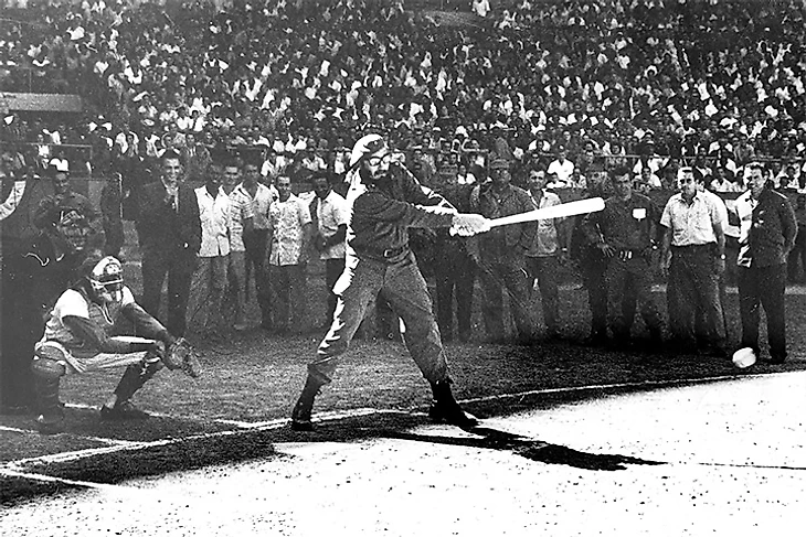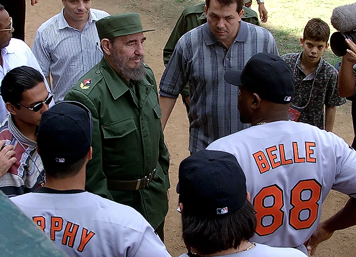 Выставочный матч между сборной Кубы по бейсболу и «Балтимор Ориолс». Кастро общается с американцами.