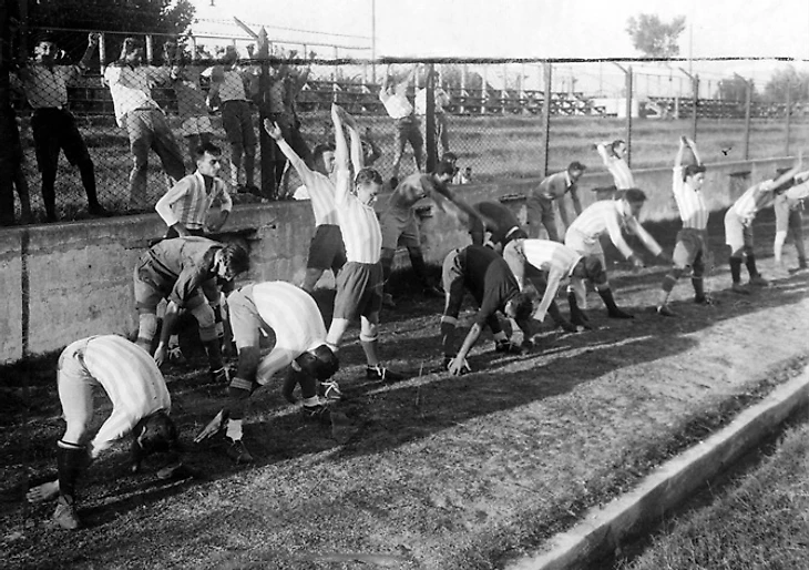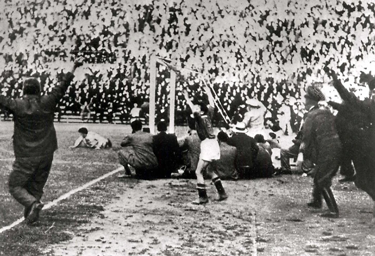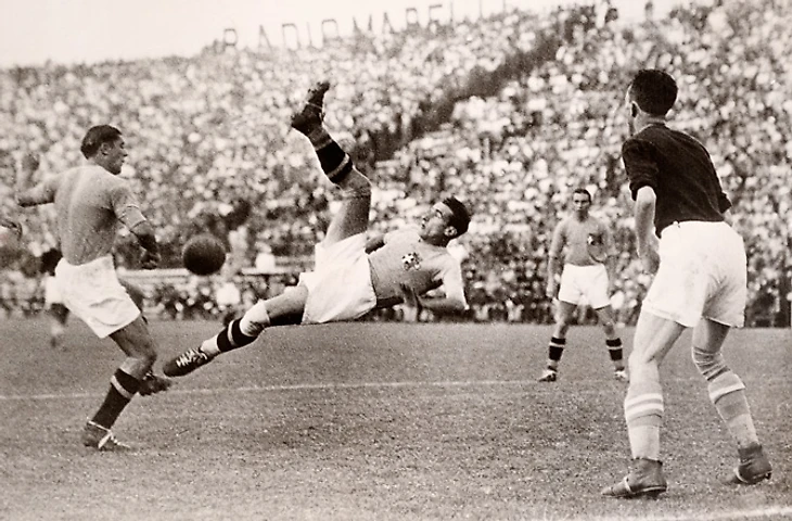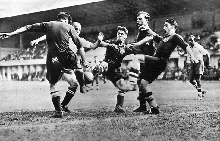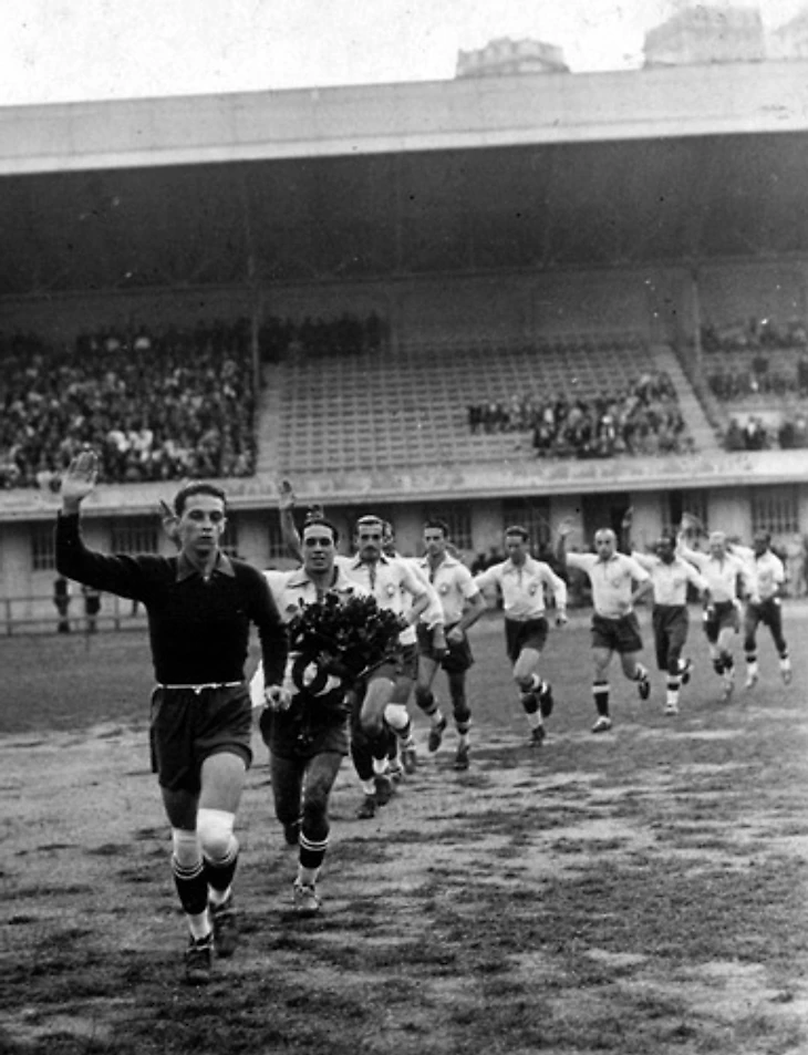Крайний слева – тренер сборной Италии Витторио Поццо, празднующий гол Раймундо Орси. Италия сравняла счет за 9 минут до конца основного времени, а в дополнительное победила – 2:1.