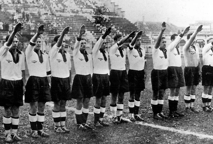 Сборная Германии приветствует болельщиков нацистским салютом.