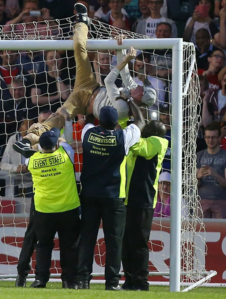 Некоторые из фанов не просто выбежали на поле, но и повисели на перекладине.