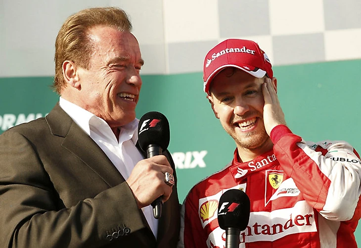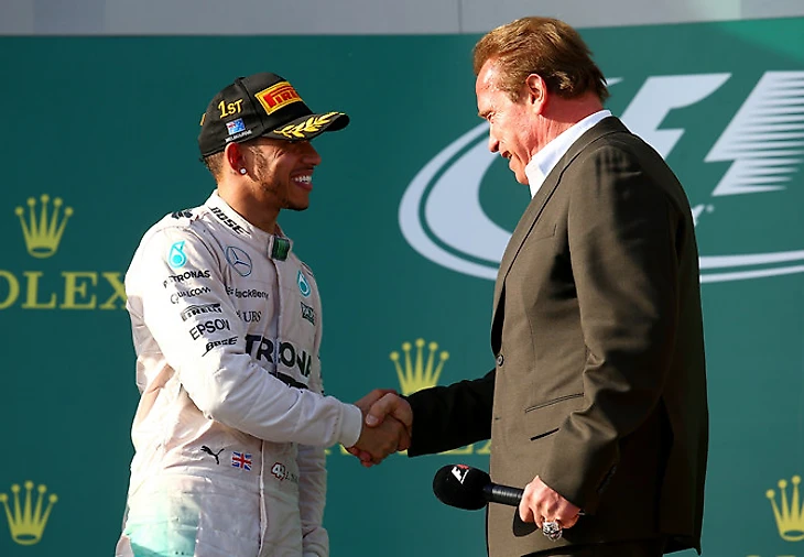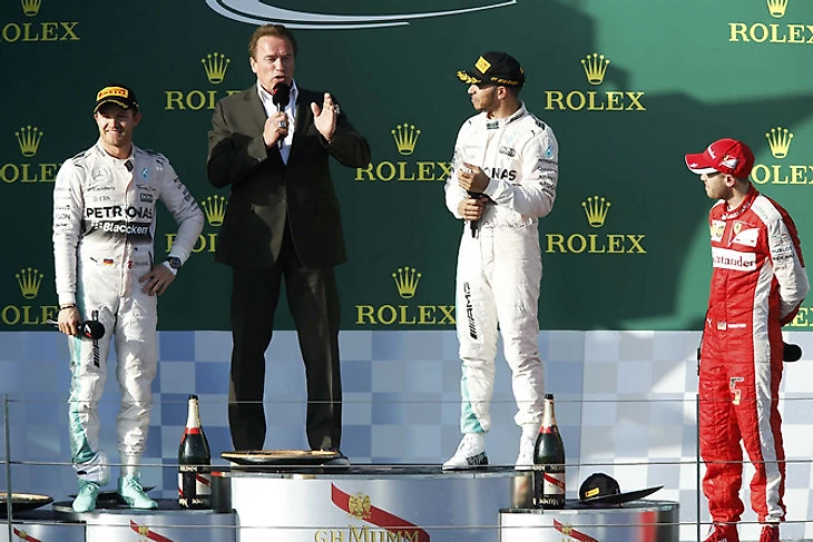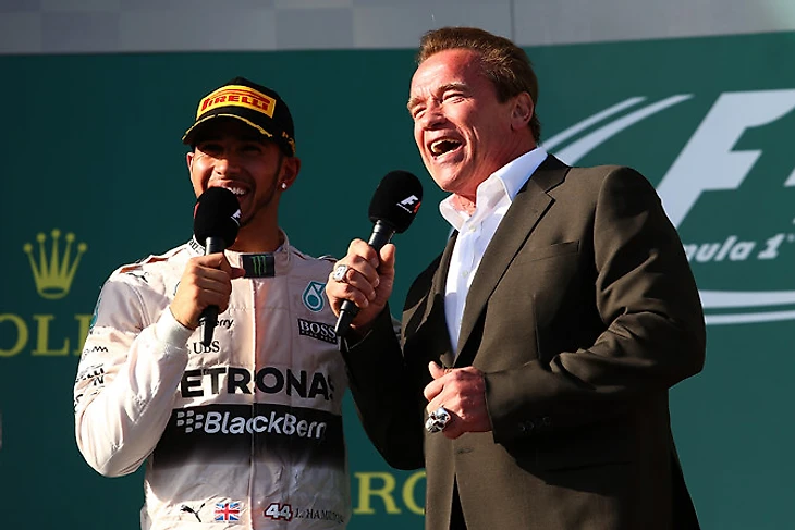 Самым ярким событием прошедшего в Мельбурне Гран-при Австралии стало появление на подиуме легенды культуризма и кино, а также бывшего губернатора Калифорнии Арнольда Шварценеггера. В прошлом «Арни» несколько раз появлялся на гонках «Формулы-1», но сегодня он впервые взял интервью у призеров этапа – Льюиса Хэмилтона, Нико Росберга и Себастьяна Феттеля.