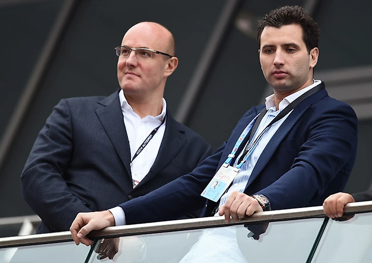 Генеральный директор «Газпром-Медиа Холдинга», глава Континентальной хоккейной лиги Дмитрий Чернышенко (слева).
