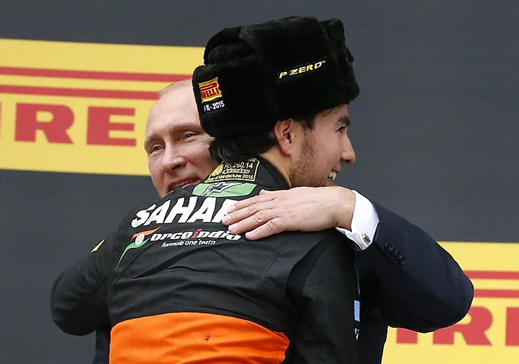 Владимир Путин обнимает Серхио Переса на подиуме.