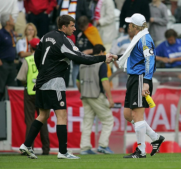 Вратарь Александр Колинько и Оливер Кан. После Евро Колинько перешел в «Рубин», а сейчас играет за юрмальский «Спартак».