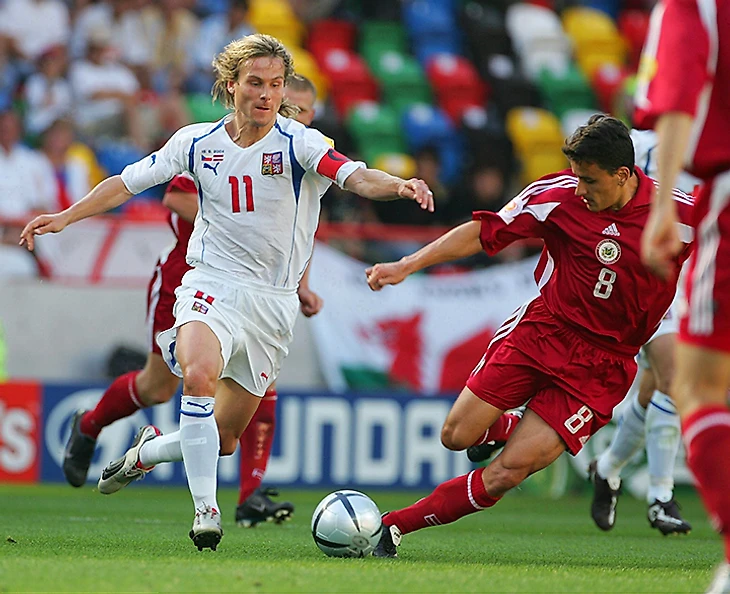 Имантс Блейделис против Павла Недведа. После Евро Блейделис перешел из датского «Виборга» в австрийский ГАК, а семь лет назад завершил карьеру.