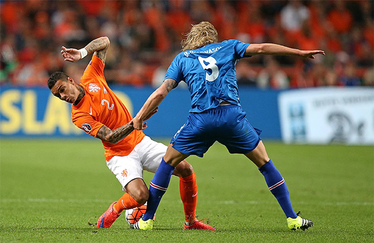 Бруно Мартинс Инди получил красную карточку в первом тайме домашней игры с Исландией. Данни Блинду пришлось менять лучшего своего снайпера Хунтелара на защитника Бруму, и Голландия проиграла 0:1.