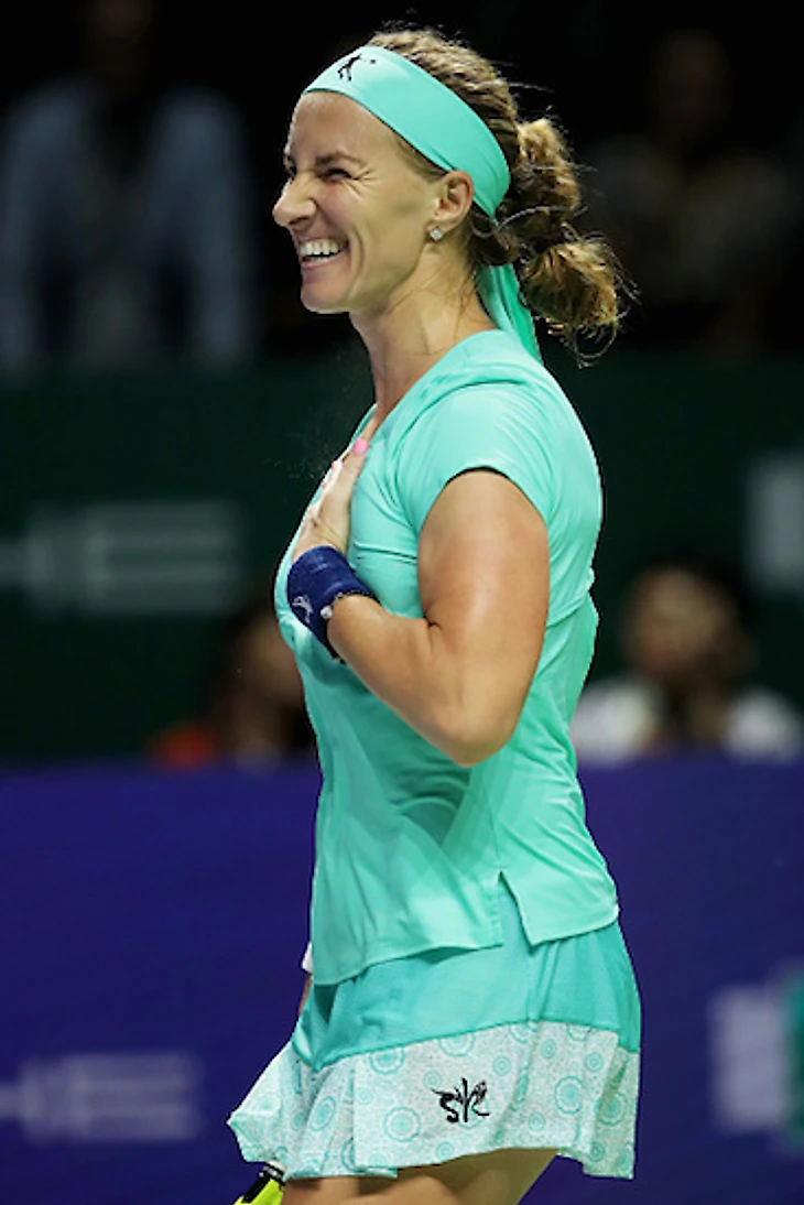 Так, на второй неделе этого сезона в январе Светлана посетовала, что каждый год долго запрягает, – а через два дня победила на турнире. Потом она месяц не могла выиграть ни матча, повторив самое разгромное поражение за всю карьеру, а еще через месяц обыграла Серену Уильямс практически у нее на заднем дворе – на турнире в Майами, – заметив после матча, что чувствовала себя не так уж хорошо. Всего за сезон Кузнецова сыграла в трех финалах, чего не случалось с ней со знакового 2009-го, и через две недели после 31-летия вернулась в Топ-10 – впервые за шесть лет. На «Шлемах» в этом году она дважды дошла до второй недели, выиграв больше матчей, чем за два предыдущих сезона. Обыграв сегодня в Сингапуре Радванску, она уже выиграла на итоговом столько же матчей, сколько за три своих последних участия в нем (2007-09).
