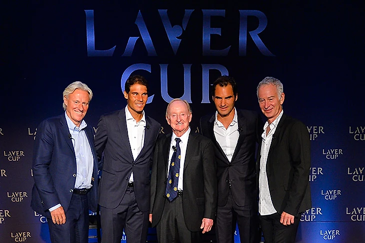 На презентации нового турнира – Кубка Лэйвера – с Бьорном Боргом, Рафаэлем Надалем, Родой Лэйвером и Джоном Макинроем
