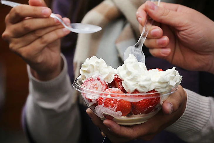 Как и на любом спортивном мероприятии мирового уровня, на «Уимблдоне» можно съесть и выпить практически что угодно. Фирменные напитки турнира – шампанское и лимонадные коктейли на основе ликера Pimm’s, а главное лакомство – конечно, клубника со сливками. Ягоды, собранные накануне в графстве Кент, доставляются в AELTC в 5:30 утра, проверяются, чистятся и расладываются в прозрачные креманки (минимум десять в одной). Последние несколько лет порция стоит 2,5 фунта, а за турнир съедается порядка 28 тонн клубники под 7 000 литров сливок.