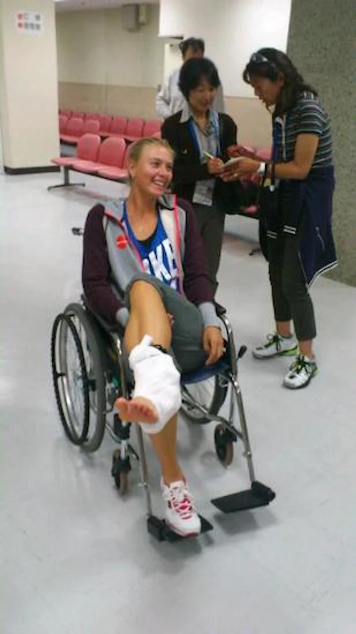В четвертьфинале турнира в Токио Шарапова встречалась с Петрой Квитовой впервые после поражения в финале «Уимблдона», но не смогла не только взять реванш, но даже закончить матч: в середине первого сета Мария подвернула ногу и снялась. На следующий день она опубликовала фотографию улыбающейся себя с перевязанным голеностопом и в кресле-каталке с подписью «Для здоровья полезнее смеяться, чем плакать!»
