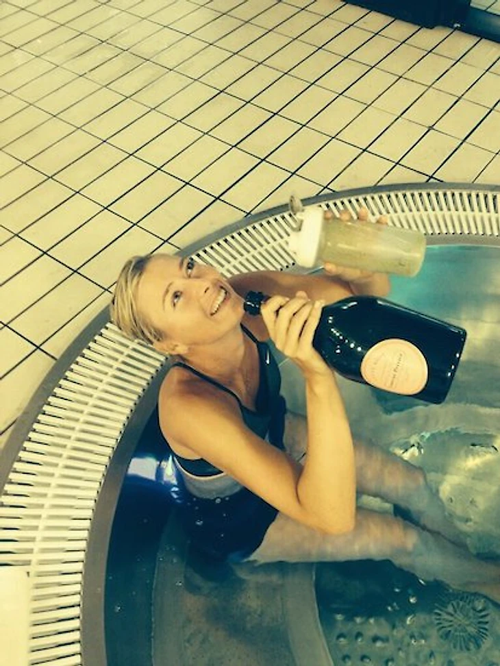 Ванна и шампанское – пошловатый образ, не слишком ассоциирующийся с Шараповой, – вот Мария и обыграла его по-своему: после триумфа в Мадриде опубликовала фотографию себя, принимающей ледяную ванну, с пустым стаканом из-под выпитого зеленого сока и пустой бутылкой из-под премиального розового Laurent-Perrier, предварительно вылитого на нее в честь победы.
