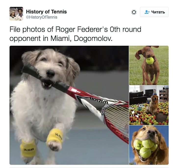 Чуть позже Ровелл признал, что это действительно была тренировка Федерера с Александром Долгополовым, и все твиты удалил. И только твиттер продолжил фантазировать, как выглядел Догомолов – соперник Роджера Федерера по нулевому раунду «Мастерса» в Майами: