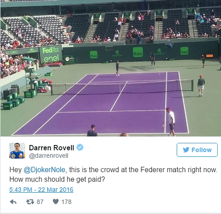 В качестве аргумента Ровелл привел матч Роджера Федерера, на котором зрителей было вопиюще мало: