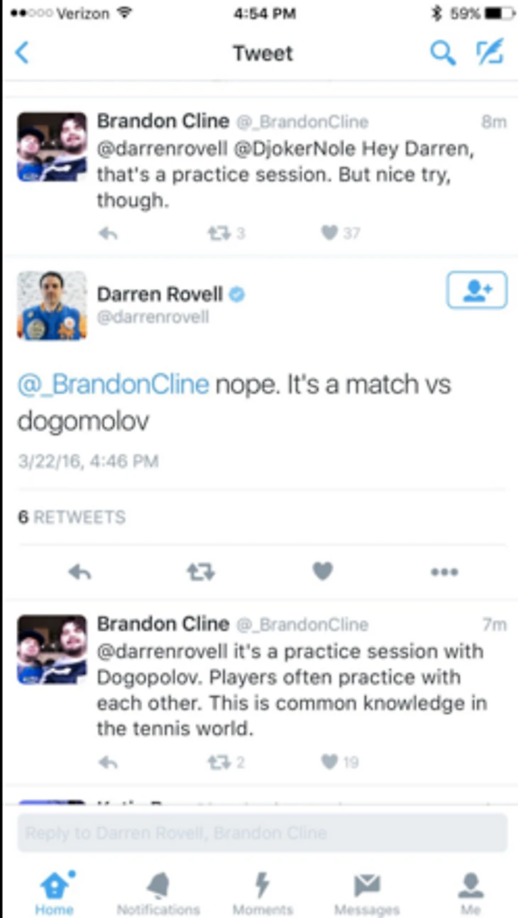 Только, конечно же, это была тренировка, а никакой не матч, на что Ровеллу тут же указала куча пользователей, включая Райана Харрисона и Энди Роддика.