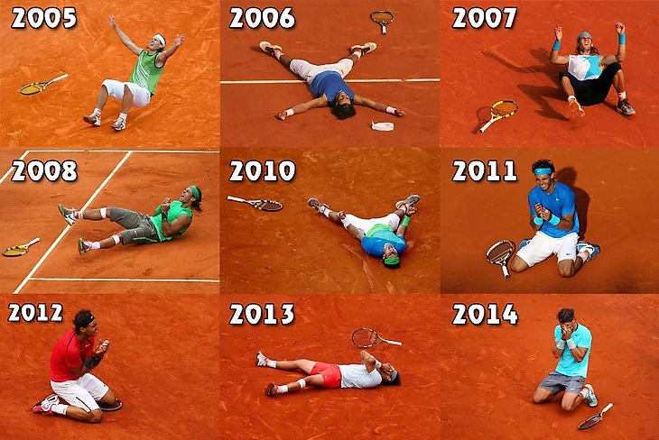 Почти десятилетнее господство Надаля в Париже – аномалия сразу на нескольких уровнях: никто кроме него не побеждал на одном турнире больше восьми раз; на турнирах «Большого шлема» никто, кроме Надаля, Федерера и Сампраса, не побеждал даже семь. На Открытом чемпионате Франции Надаль рекордсмен по проценту (97,2) и количеству (70) выигранных матчей, продолжительности беспроигрышной серии (35 матчей), а также по количеству финалов (9 всего, 5 подряд). До пяти парижских финалов (2007-12) Рафа дошел, не потеряв ни сета, и дважды (2008, 2010) не проиграл ни сета и в титульных матчах (против Федерера и Содерлинга).