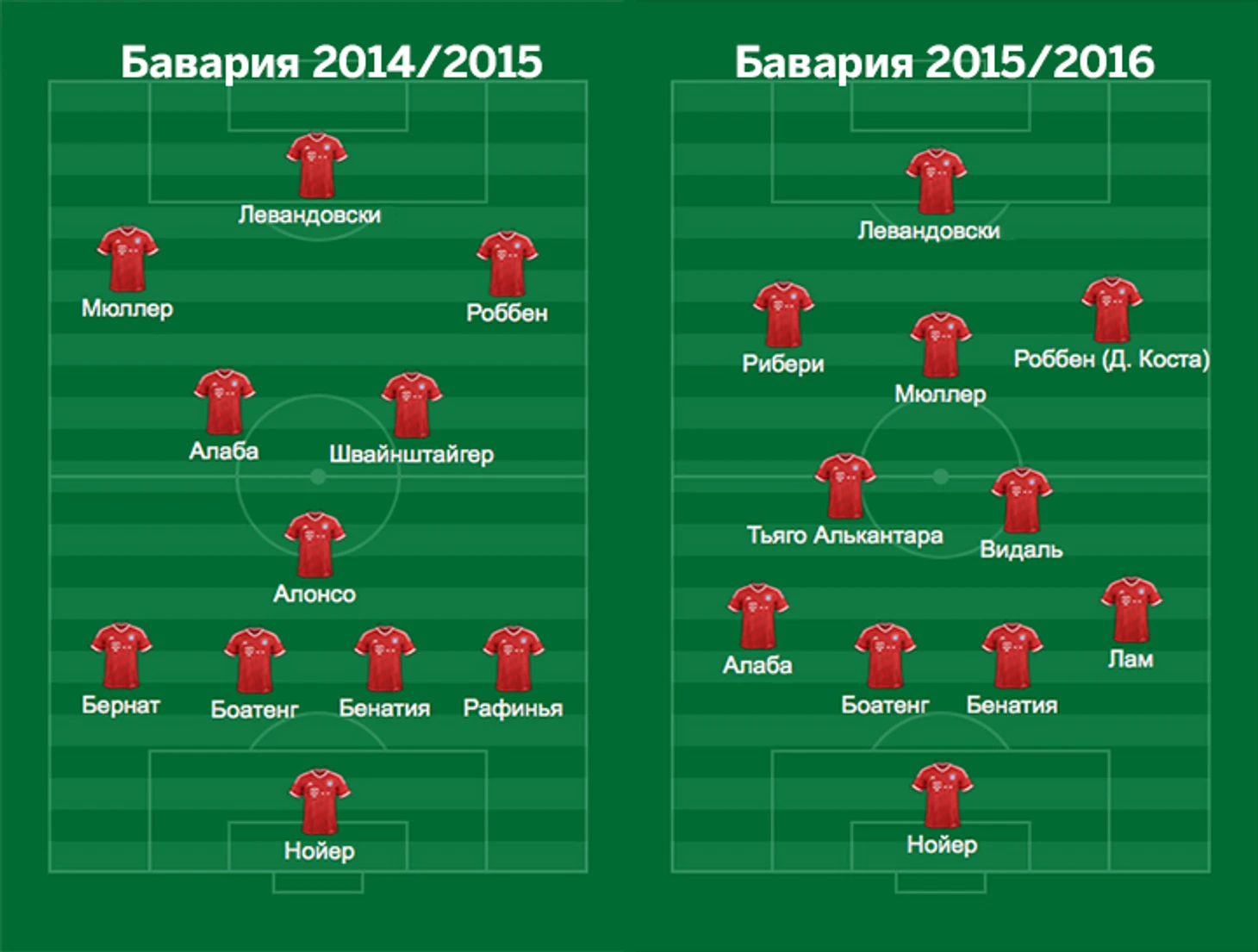 В общей сложности Гвардиола перепробовал в прошлом сезоне аж 9 различных формаций. Сначала перестановки проводились с позиции тренера-исследователя – Пеп каждому лидеру стремился найти идеальное место на поле, но где-то ближе к концу чемпионата, когда из-за травм «Бавария» порой не досчитывалась 5-6 человек основного состава, приходилось вносить изменения, реагируя уже на появление проблемных зон. Из-за того, что мюнхенцы использовали одну и ту же схему не больше двух раз подряд, вы можете себе представить, как трудно было выбрать нечто усредненное в бесконечных тактических экспериментах испанца.
