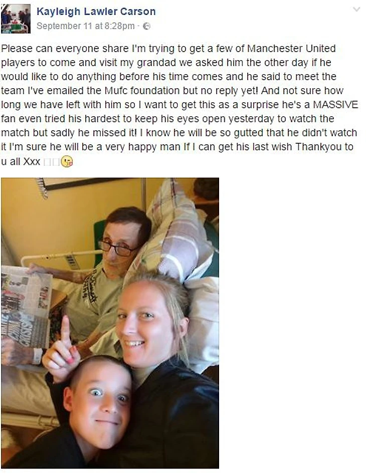 Внучка заядлого болельщика «Ман Юнайтед» опубликовала в фейсбуке эмоциональное письмо, где попросила исполнить последнее желание своего деда – встретиться с футболистами любимого клуба. 73-летний Патрик Лоулер боролся с раком, но по-прежнему не пропускал ни одного матча «МЮ».