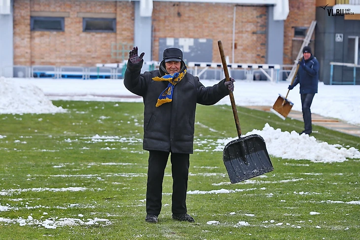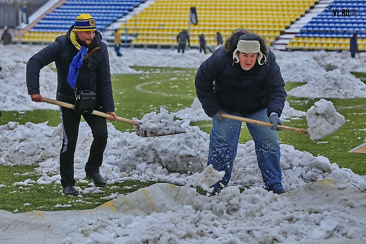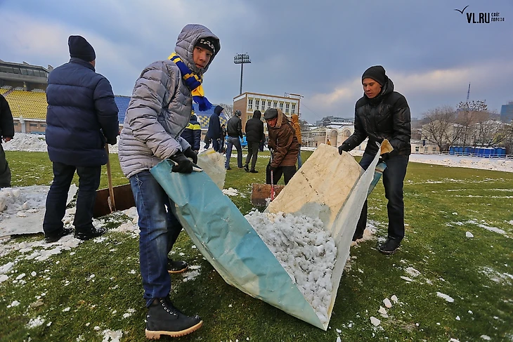 Лопатами собирать снег вызвалось несколько десятков болельщиков. Вместе с сотрудниками на поле было около 50 человек.
