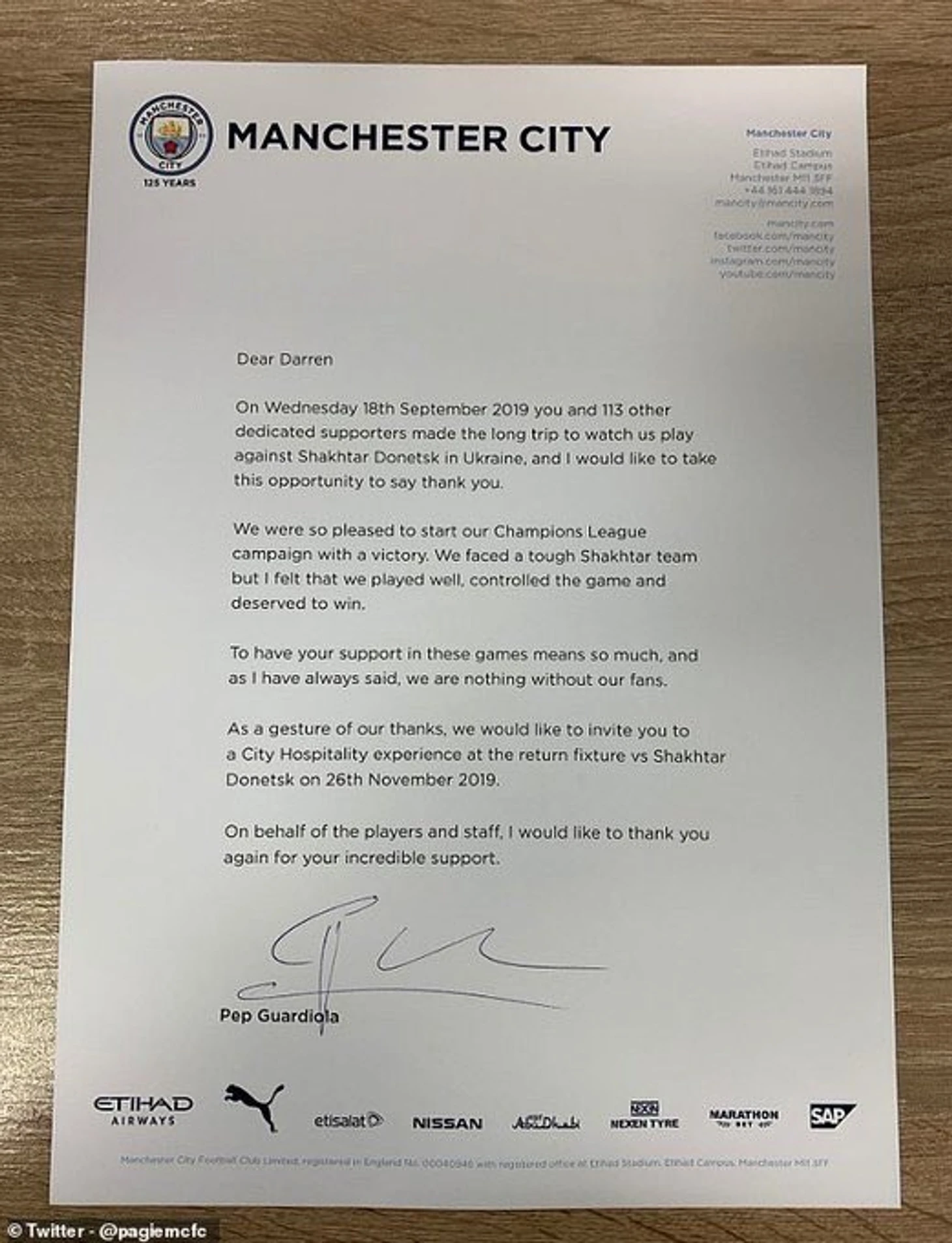 Ехать долго, посреди недели, дорого и не очень интересно. Но 114 самых верных фанатов пробили тяжелый выезд. На днях они получили письмо с подписью Пепа Гвардиолы.
