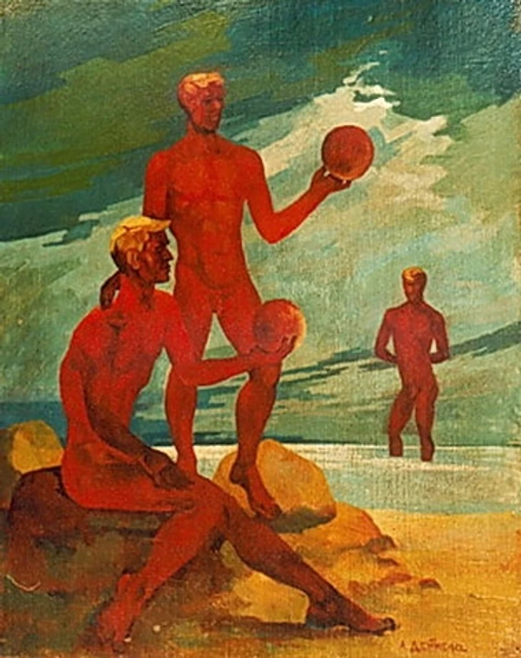 Ручной мяч вполне мог бы отобразить великолепный мастер спортивной живописи Александр Дейнека. Однако повсеместное развитие игры в СССР началось уже в последние годы жизни художника. Поэтому единственным его произведением, где в руках у персонажей есть мяч, чем-то напоминающий гандбольный, стала картина "На пляже".