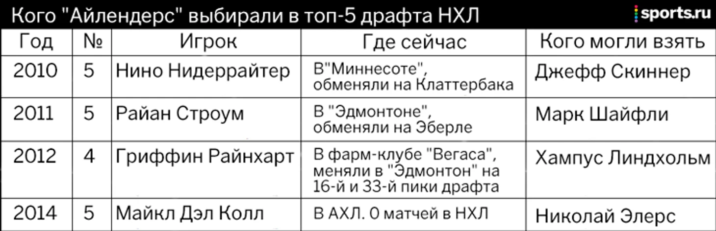 А вот настоящим упущением многих, кто выбирал в топ-10, стал Владимир Тарасенко, который ушёл лишь 16-м только из-за пресловутого "русского фактора". Хотя ещё до драфта было понятно, что это будет край с убойнейшим броском уровня Могильного. Но зато он попал в команду, которая его хотела и которая разменяла одного из своих топ-проспектов на право выбрать Тарасенко. А в "Айлс" ему вполне могли запороть карьеру, как Нидеррайтеру.
