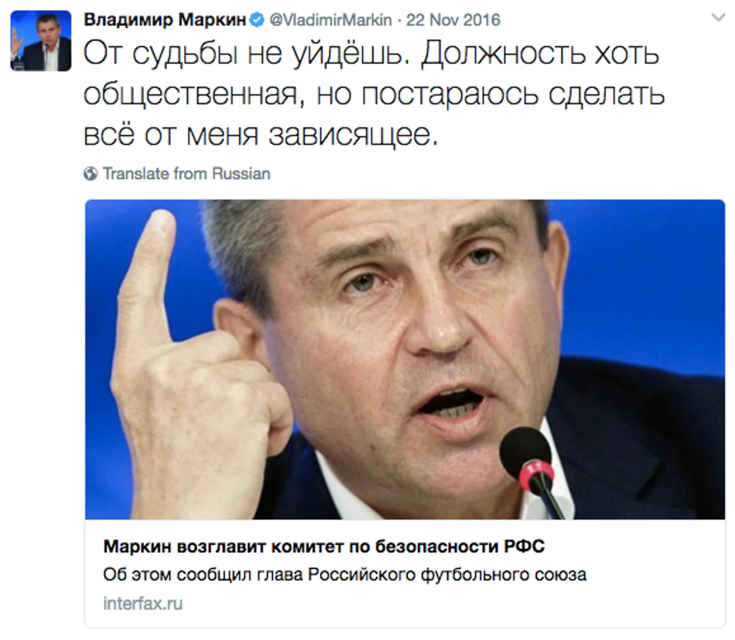 Месяц спустя у Маркина появилась еще одна большая должность – председатель комитета РФС по безопасности и работе с болельщиками. В интервью «Матч ТВ» Маркин рассказал, что возглавить комитет ему предложил лично Виталий Мутко.