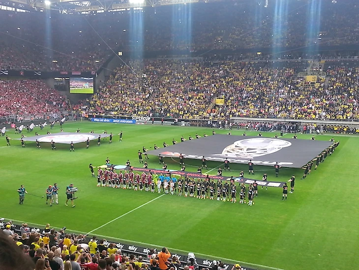 «Желтая стена» вообще делала все, чтобы зрители на стадионы забыли о неофициальном статусе игры. Вот, например, как болельщики «Боруссии» поют перед игрой.