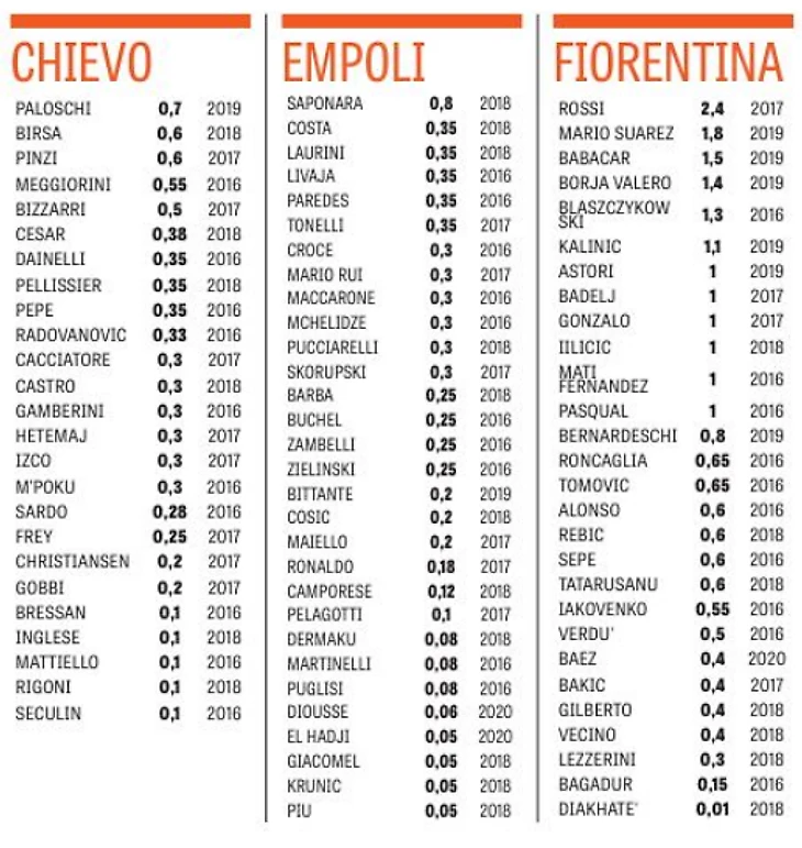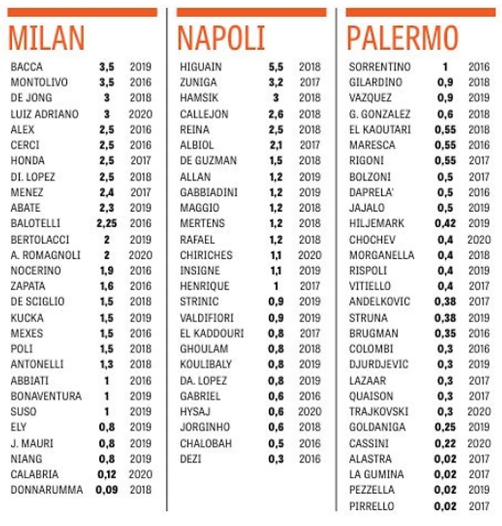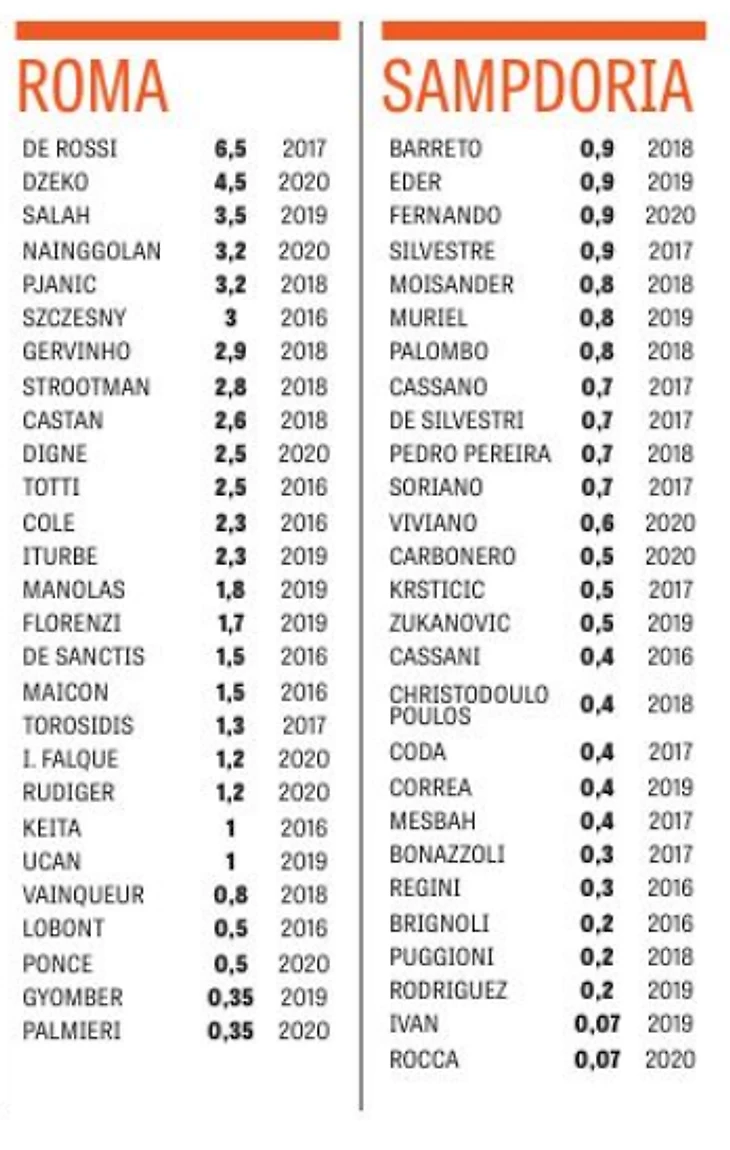 Цифры рядом с названием команды означают общий фонд зарплаты в миллионах евро (лордо) с учетом базовых зарплат, премий, бонусов и налогов, которые выплачивает клуб. Цифры рядом с фамилией игрока означают его чистую базовую зарплату в миллионах евро (нетто) без учета премий, бонусов и налогов.