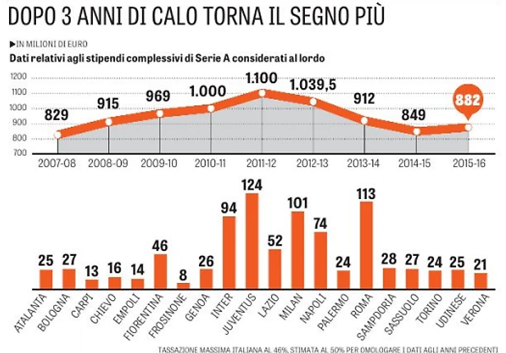 Впервые за три сезона зарплаты в Италии увеличились, но до рекордных 1.1 млрд еще далеко.