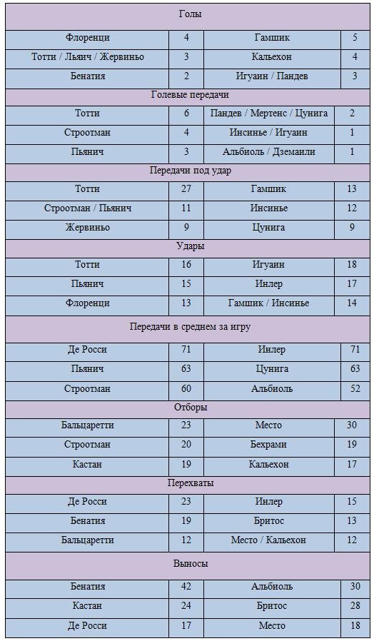 Бенитес активно использует ротацию состава. Все 7 матчей в стартовые 11 игроков попадал всего 1 человек, которым был Рейна. В атаке у тренера «Наполи» есть масса вариантов. Лидером команды по-прежнему является Гамшик. Марек 14 раз пробил по воротам, из них 5 влетели в сетку (лучший бомбардир), создал для партнеров 13 моментов, правда, ни один из них не стал голевым. Прекрасно влились в состав испанские новички команды. Альбиоль – лидер по выносам (30), Игуаин нанес больше всех ударов – 18 и забил 3 мяча (негусто), а Кальехон, можно сказать, стал вторым после Гамшика. Хосе не только отметился 4 взятиями ворот соперника, но и очень старательно отрабатывал в обороне, на его счету 12 перехватов и 17 отборов, что для игрока атаки выдающийся показатель. Кальехону, может быть, не хватает яркости в его действиях, зато старательности хоть отбавляй.