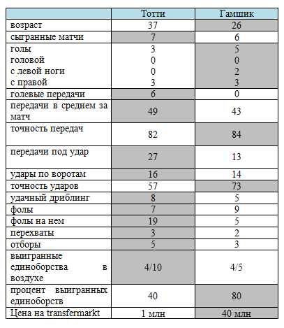 Гамшик со временем и при определенных обстоятельствах может стать для «Наполи» таким же легендарным игроком, как Тотти для «Ромы». Пока Марек значительно уступает Франческо, которому 37 лет, по показателям связанным с созданием моментов. Он нанес на 2 удара меньше и в 2 раза реже выводил партнеров на ударные позиции (13 против 27). Тем не менее, Гамшик демонстрирует свой уровень, он является лидером команды по забитым мячам (5) и показывает высокую точность по ударам в створ (73%). Тотти переживает очередную молодость, сейчас он один из лучших игроков в Серии А.