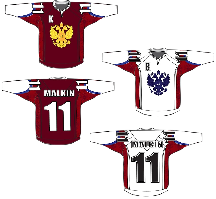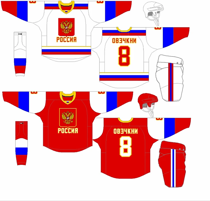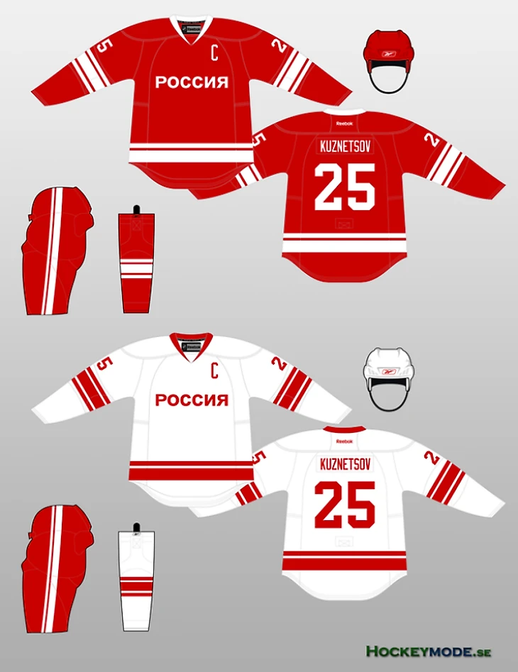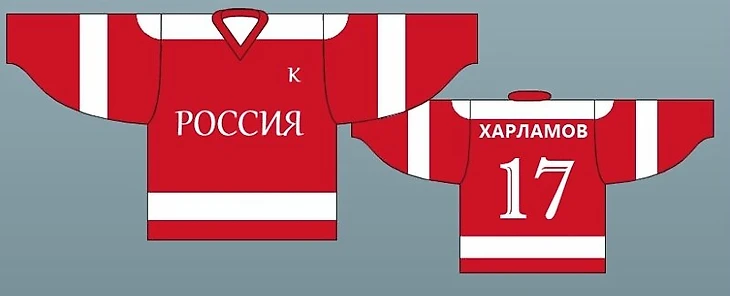 Кстати, тему возврата к концептам а-ля «Красная машина» регулярно педалируют и зарубежные господа концептёры, с трудами которых мы в этом блоге уже знакомились как применительно к всей КХЛ, так и конкретно к клубу СКА. Ретро - это же модно, а в нашем случае - и стильно! Давайте посмотрим, какие находки у них есть для сборной России: