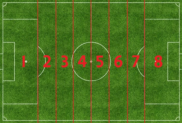 4. Деление футбольного поля на 8 зон. Более подробное деление, служащее основной для построение игры команды En Assemble в стиле "тики-така".
