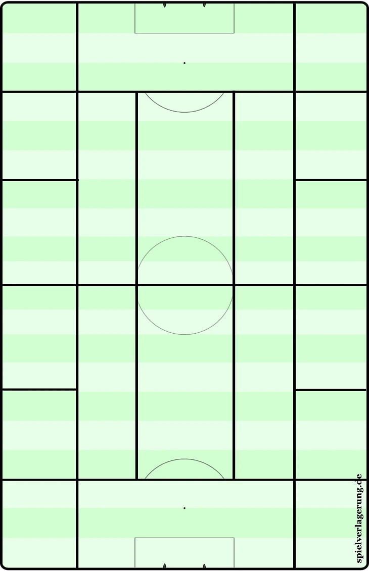 2-1. Деление футбольного поля поперек на 3 зоны. Подразумеваются: зона обороны (первая треть поля), центральная зона (вторая треть поля) и зона атаки (последняя треть поля). Сейчас считается важным как быстрый проход атакующей команды через вторую треть в последнюю треть поля, так и большинство атакующих действий именно в последней трети поля.