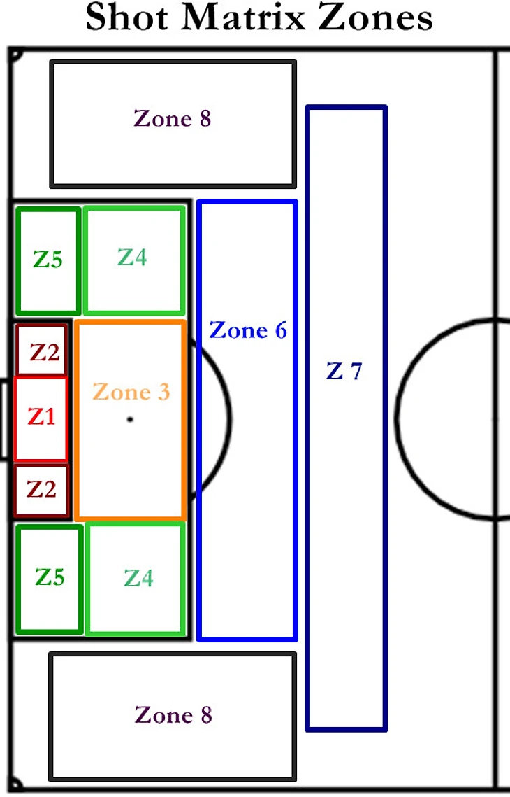Как пример, одно из делений поля на зоны для статистического определения точности передач голкиперов и определения опасности атакующих действий команды.