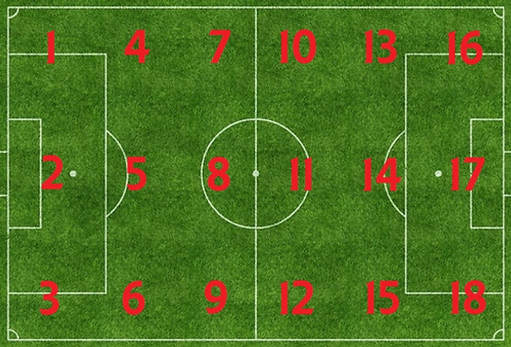 Наиболее важной для атаки является зона 14. Не следует думать, что деление поля на 18 зон у всех тренеров одинаково. Луи ван Гал делил зоны, делая центральную значительно шире фланговых (зоны 2-5-8-11-14-17), а Арриго Сакки делил поле на 18 одинаковых частей, делая упор на работу в условных точках "перекрестия".