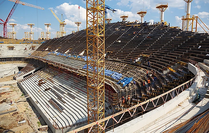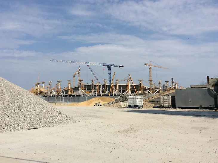 И самое главное – стадион, на котором пройдут 4 матча группового этапа. Год назад, насколько я помню, здесь был один фундамент, сейчас там завершены все монолитные работы – это основное 5-этажное здание сектора А, а также остальные 3-этажные помещения. Монтаж собранных секций осуществлялся с помощью двух кранов грузоподъемностью 150 тонн. Снаружи чаши собран передвижной кран грузоподъемностью 750 тонн – он примет участие в монтаже укрупненных 65-тонных фасадных секций, а далее послужит для устройства компрессионного кольца.