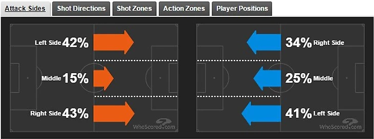 «Спарта» (оранжевый) отдает предпочтение фланговым атакам. Преимущество здесь имеет правый фланг – зона Караваева и Чермака.