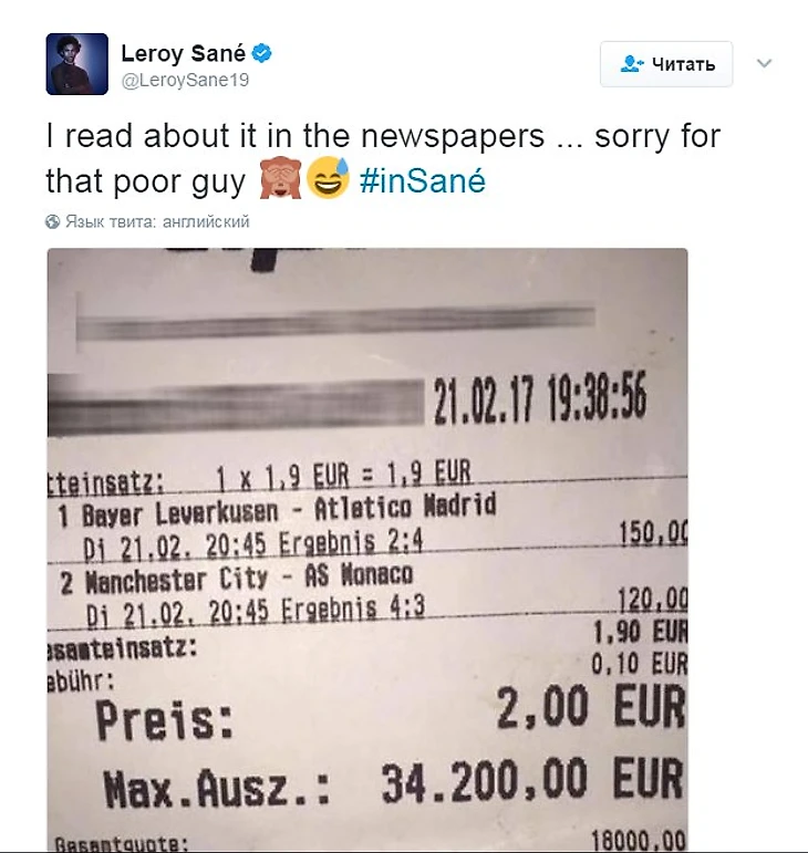 Лерой Сане, забив 5 гол в ворота "Монако", испортил экспресс на 34 тысячи евро.