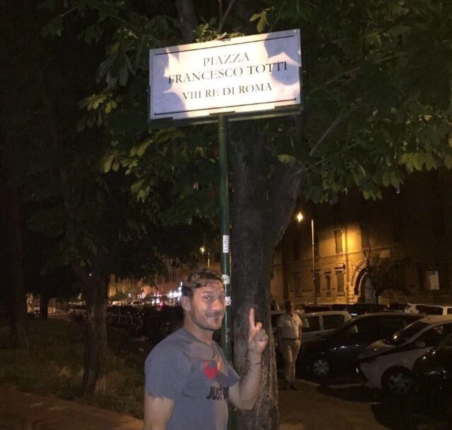 После великолепного прощания по инициативе самих фанатов была переименована одна из площадей Рима. Ранее площадь Санта Марии теперь будет называться Площадь Франческо Тотти. Сам “император“ не мог пройти мимо этой таблички