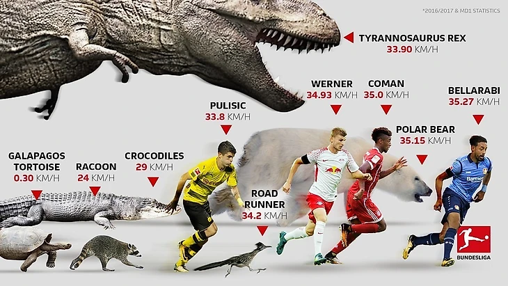 Официальный Twitter Бундеслиги сделал оригинальную рекламу чемпионату Германии, сравнив скорость самых быстрых футболистов со скоростью представителей дикой природы