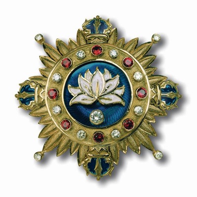 Орден представляет собой слегка выпуклый эмалево-золотой круг, обрамлённый пучками расходящихся платиновых лучей. На кончике средних лучей в каждой четвёртой части круга закреплено по бриллианту. В центре круга на голубом эмалевом фоне расположено платиновое рельефное изображение белого лотоса, под которым помещён бриллиант. Центральная часть ордена заключена в золотую сдвоенную ваджру. В золотом кольце ваджры размещаются восемь рубинов и между ними восемь бриллиантов. Вершины ваджры в углублениях заполняются голубой эмалью. Размер ордена между вершинами ваджры — 54 мм. (Википедия)
