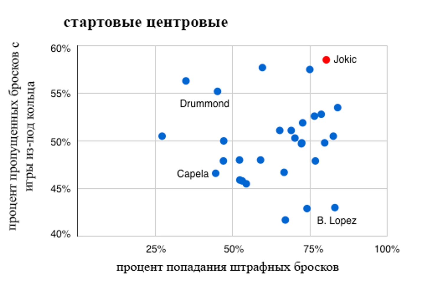 Да, Йокич достаточно опытен в нападении, но он не великий атлет и он недостаточно высок для центрового, к тому же его вингспан составляет всего 220 сантиметров. Он вряд ли станет элитным блокирующим, и он вряд ли будет хорош в расставлении заслонов на периметре, поэтому вокруг него будет сложно построить хорошую оборону. Он должен стать мастером позиционной защиты, а остальные игроки должны стараться держать своих оппонентов перед собой. У большинства атакующе-настроенных «больших» были проблемы в защите в начале карьеры, и Йокич – не исключение. Как правило, у центровых существует компромисс между атакующим потенциалом и оборонительными навыками, и Йокич – яркий тому пример. Он входит в топ лучших по штрафным броскам на своей позиции, но также он имеет один из самых высоких процентов пропущенных бросков с игры у кольца.