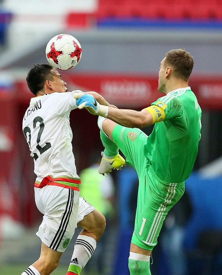 Чудовищный по своей нелепости, невероятно обидный гол. Но, что самое главное, этот гол просто пропитан футбольным кретинизмом, что совершенно не характерно для Игоря. Только вдумайтесь: защитник сборной Мексики выносит мяч далеко вперёд, тот летит к нашим воротам. К нему устремляются три человека: Ирвин Лосано, Виктор Васин и Игорь Акинфеев, расстояние до мяча примерно одинаковое. И вот когда мяч зависает над линией штрафной, покинувший ворота (!) вратарь выпрыгивает и бьёт ногой(???) в грудь (!!!) форварда соперников.