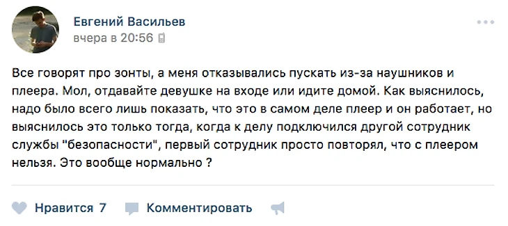 Проблемы также были у тех, кто принес на матч камеры, фотоаппараты, внешние аккумуляторы для телефонов, плееры и другие вещи. Перед матчем клуб предупреждал, что на арену не будут пропускать с термосами, про зонты речи не было.