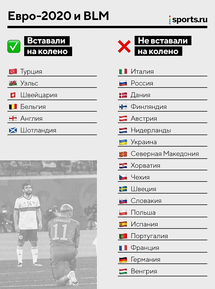 • Сборная Чехии, чей защитник Онджей Кудела перед Евро получил бан за расистские действия в Лиге Европы, не встает на колен, но поддерживает движение против расизма.