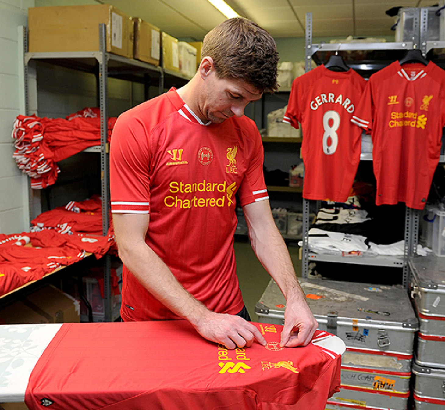«Ливерпуль» в матче с «Манчестер Сити» играл в футболках с «нашивкой 96». Стивен Джеррард демонстрирует, как правильно ее наклеить.